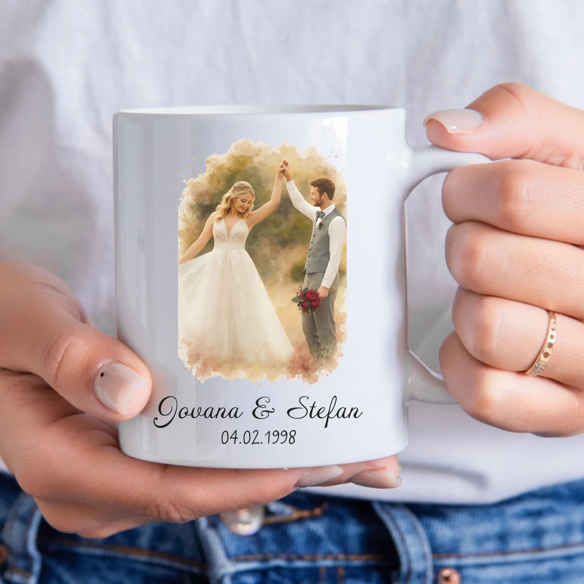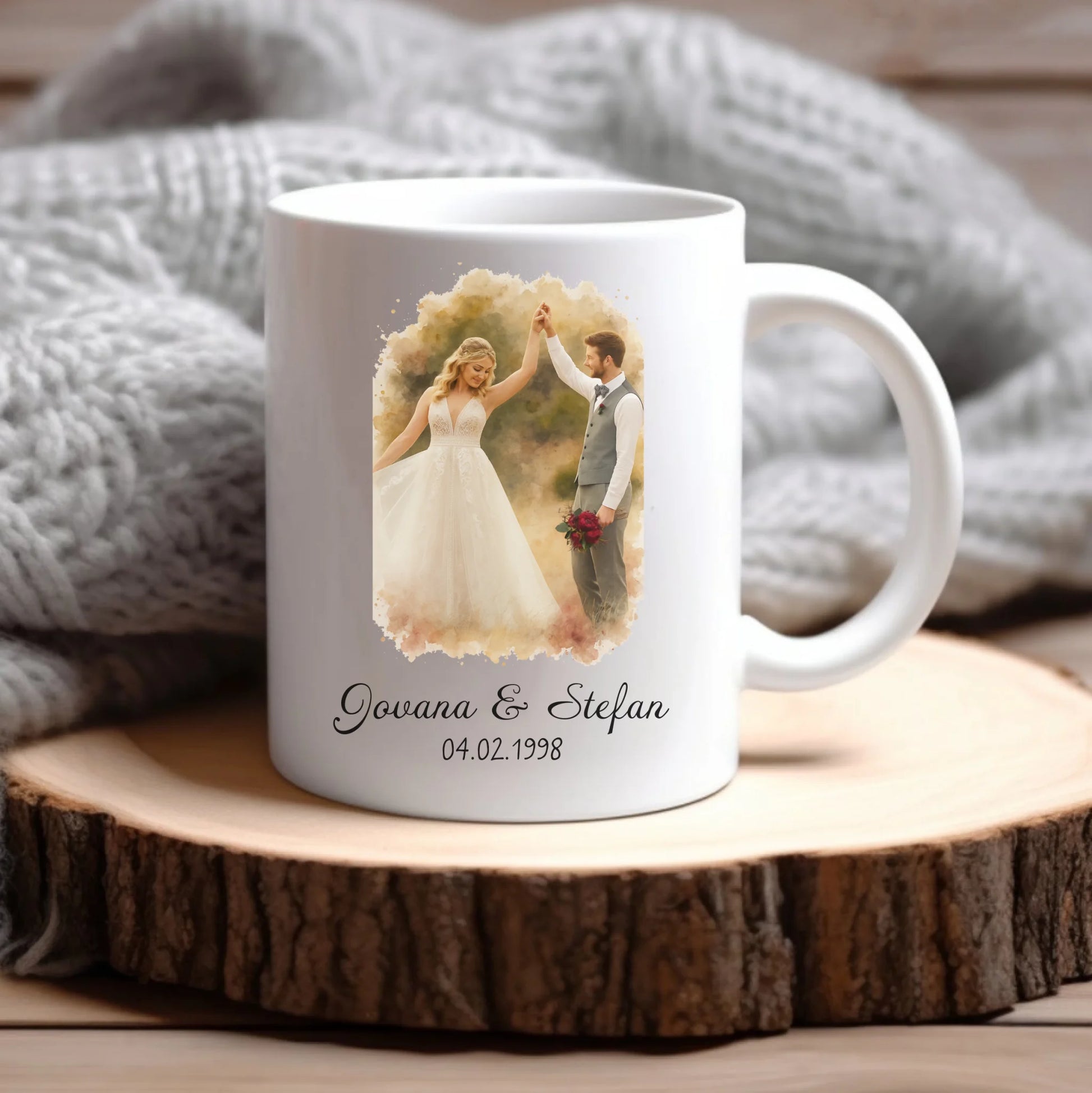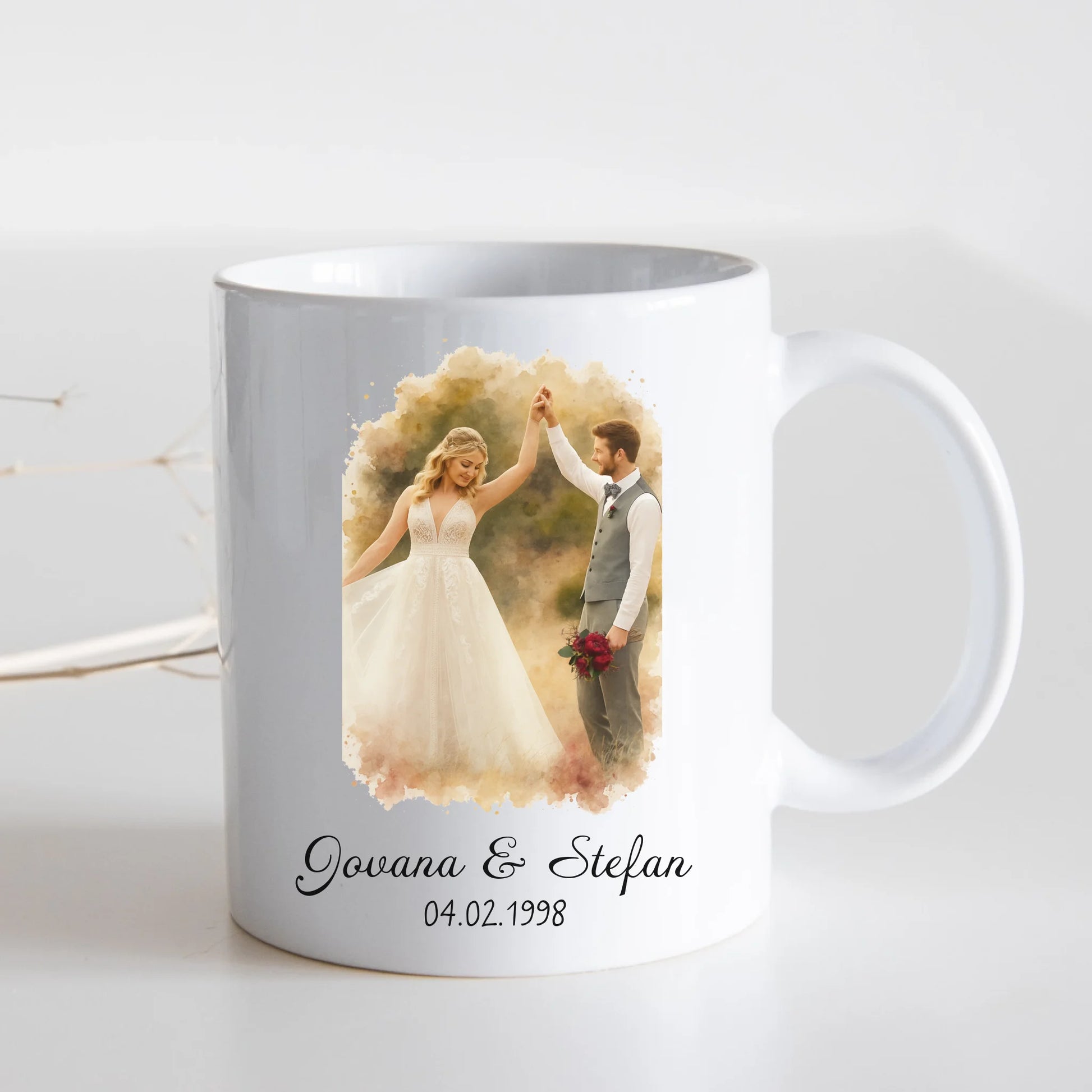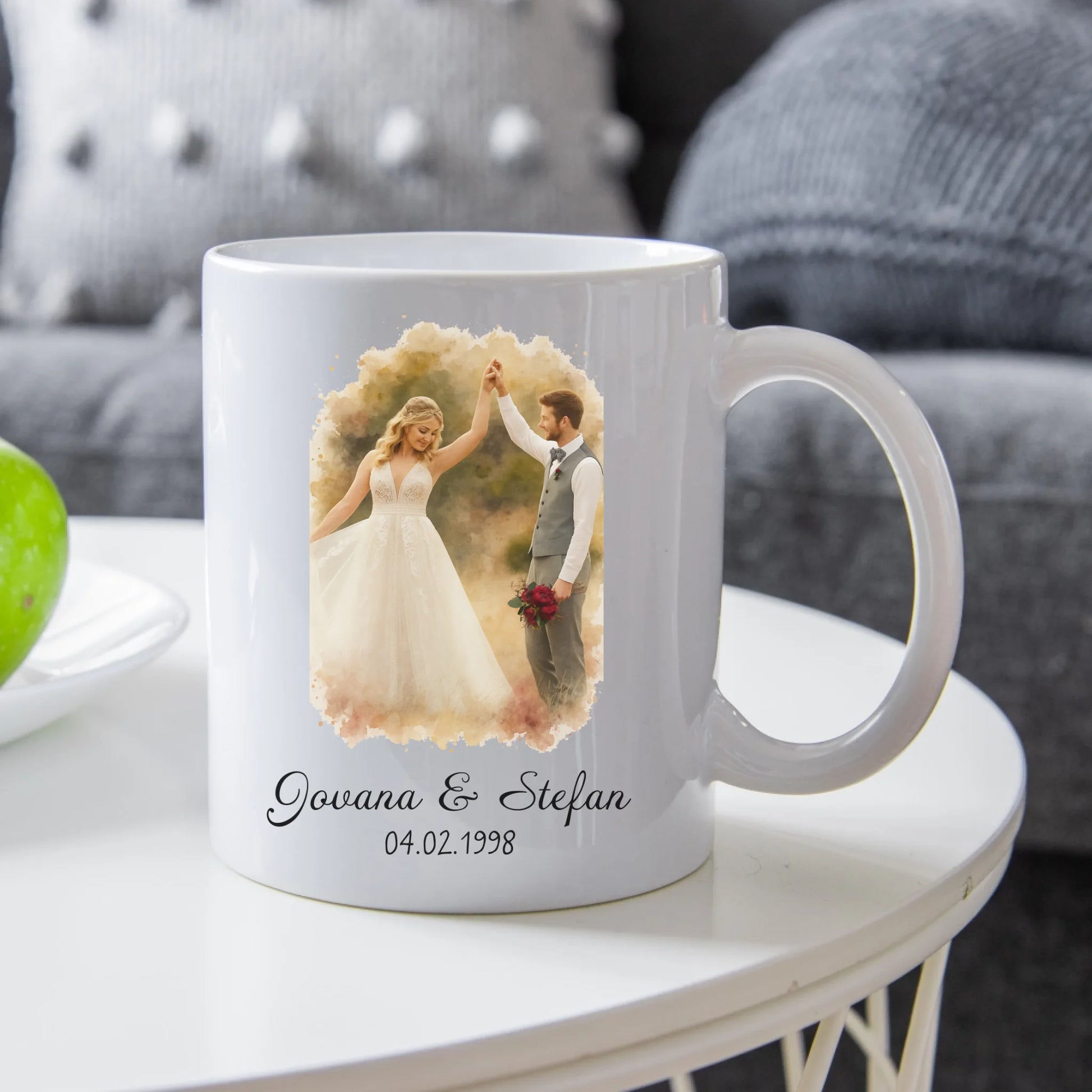 Par u akvarelnom stilu sa imenima i datumom – Šoljica
