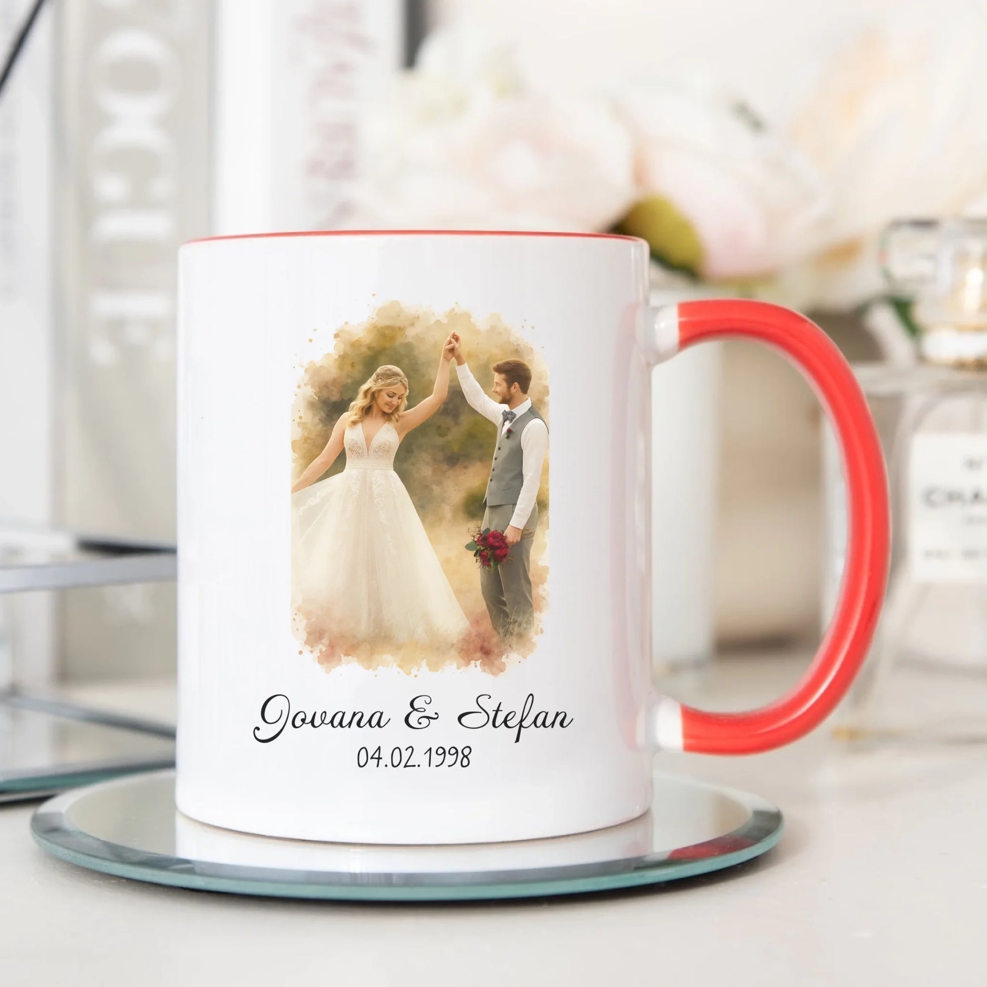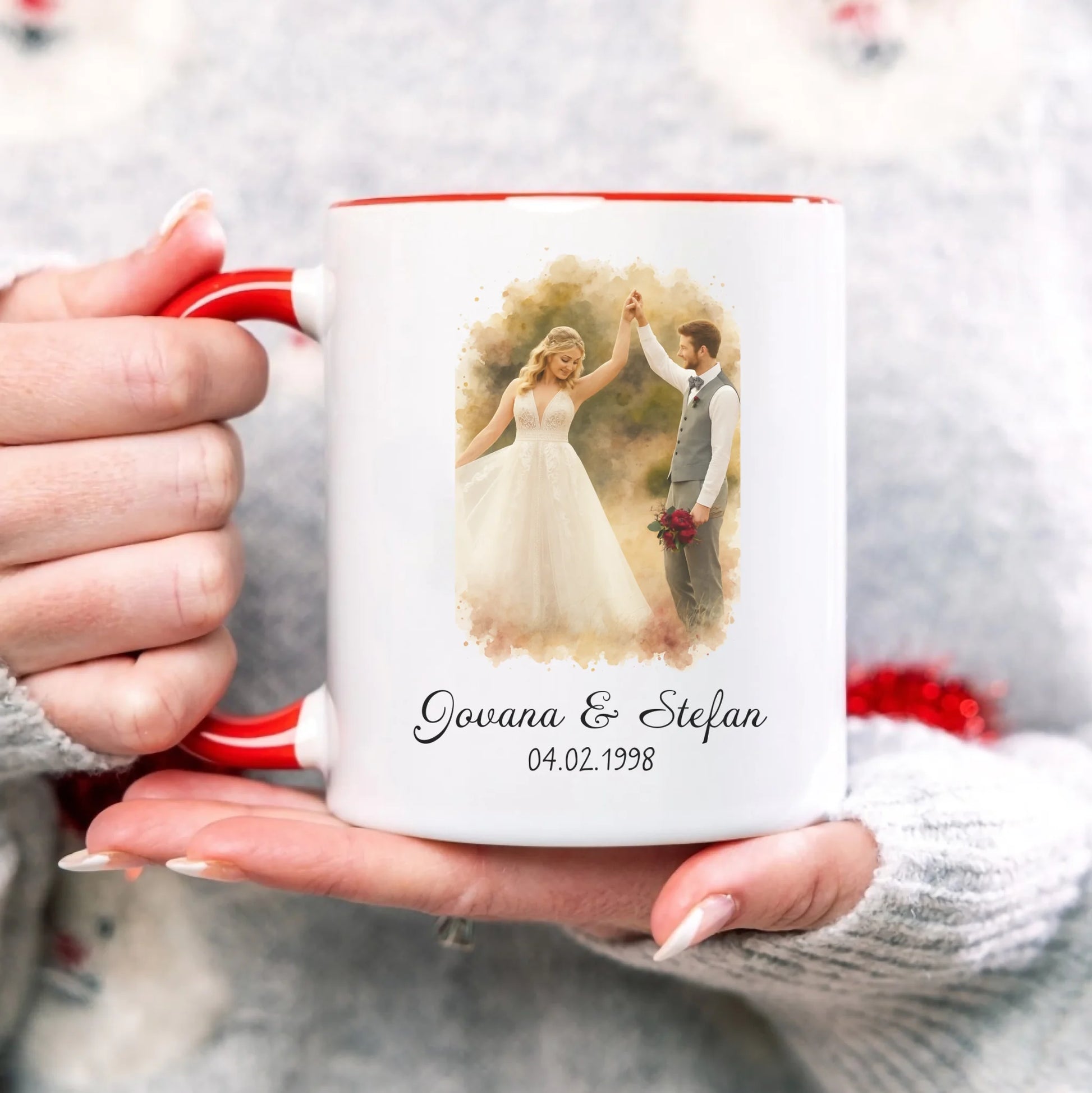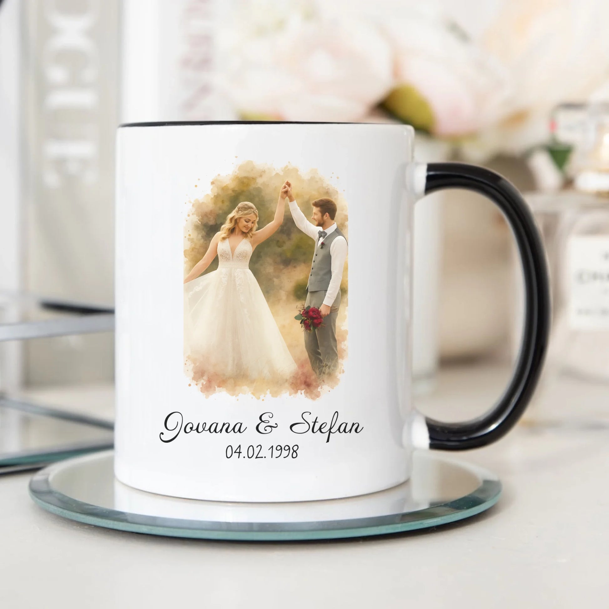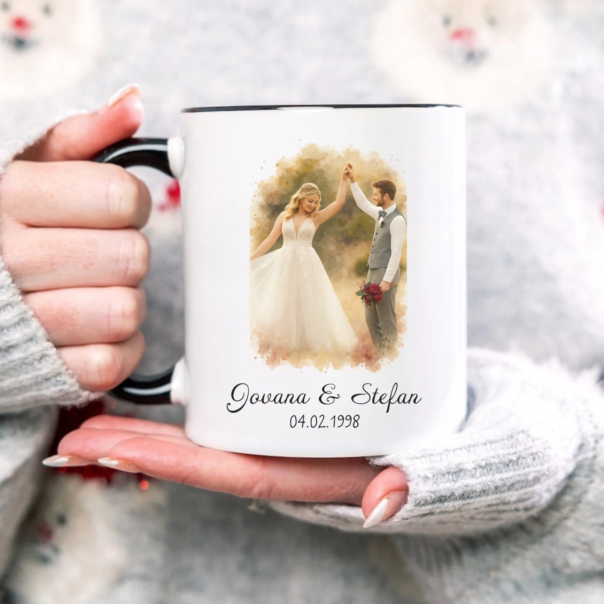 Par u akvarelnom stilu sa imenima i datumom – Šoljica